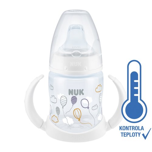 Lahvička na učení značky NUK má extra široké a měkké pítko, které zaručuje přirozený pocit pití hned od začátku.Usnadní tak dětem přechod z kojení na lahvičku. Lahvička je určená pro děti od 6 do 18 měsíců. Indikátor kontroly teploty – modrá barva se změní na bílou, pokud je obsah příliš horký.