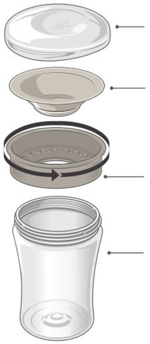 Důležité pokyny pro užívání Před prvním použitím rozložte výrobek podle návodu na jednotlivé díly, ty vyčistěte a na 5 minut umístěte do vroucí vody. Slouží to hygienickým účelům. Před každým dalším použitím pečlivě vyčistěte. V případě potřeby sterilizujte. Uchovávejte v suchu a hygienicky. Při vyvařování nebo napařování láhev vždy rozložte na jednotlivé díly a nechte otevřené, protože jinak může dojít k jejich deformacím. Při napařování doporučujeme parní sterilizátor NUK nebo NUK parní odpařovač do mikrovlnných trub. K zabránění poškození materiálu vždy dodržujte návod k použití odpařovače. Vlastnost měnících se barev podle teploty zachováte nejlépe tak, že výrobek opláchnete ručně a poté popř. vydezinfikujete. V případě potřeby můžete výrobek při dezinfekci naplnit vroucí vodou. Barvy měnící se podle teploty jsou citlivé na vlhké teplo a odvápňovací prostředky. Při častém vaporizování nebo vyvařování dochází k vyblednutí barev. Při dezinfekci plastových lahví nesmí být překročena maximální teplota 100°C (pokyn na lahvi). Savičku na krmení nebo lahev nikdy nevystavujte přímému slunečnímu záření nebo teplu nebo ji nenechávejte déle než je uvedeno v dezinfekčním prostředku (sterilizační roztok), může to snížit pevnost savičky nebo poškodit materiál. Lahve vždy ohřívejte otevřené (nebezpečí výbuchu) a ochlaďte (deformace)! Při ohřívání v mikrovlnné troubě je důležitá opatrnost; může dojít k místnímu přehřátí. Ohřáté potraviny se musí vždy promíchat a před krmením se musí zkontrolovat teplota. Hrneček nenaplňujte nápoji sycenými oxidem uhličitým nebo příliš horkými nápoji. Může vzniknout přetlak, který může vést k vytečení tekutiny. V prostorách s podtlakem (např. v letadlech) se mohou vyskytovat netěsnosti. Při plnění nápojem připraveného z instantního prášku dbejte na to, aby se prášek zcela rozpustil. Usazeniny nebo ovocná dužina mohou zhoršit funkci silikonového těsnicího kroužku. Před každým použitím se přesvědčte, že silikonový těsnicí kroužek správně přiléhá k okraji (viz obr. 1). Při přepravě nasaďte víčko.