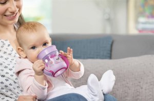 Hrneček NUK Mini Magic Cup umožňuje i těm nejmenším pít jako velké děti. 360° pitný okraj podporuje dítě ve snaze učit se pít podél celého okraje - skoro jako u běžného hrnečku. Jediný „kouzelný rozdíl“ je ten, že nápoj z hrnečku nevyteče díky silikonovému disku, který utěsňuje víčko zevnitř. Pití je dětská hra - stačí jednoduše sát hranu hrnečku.