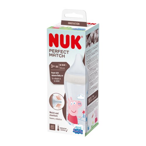 Kojenecká láhev NUK Peppa Pig Perfect Match, s měkkou silikonovou savičkou, 260 ml, od 3 měsíců, neobsahuje BPA, antikolikový systém, s indikátorem kontroly teploty, bílá