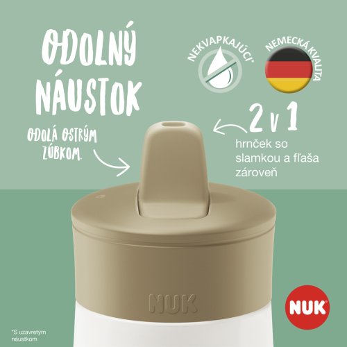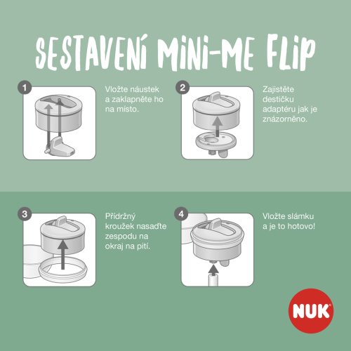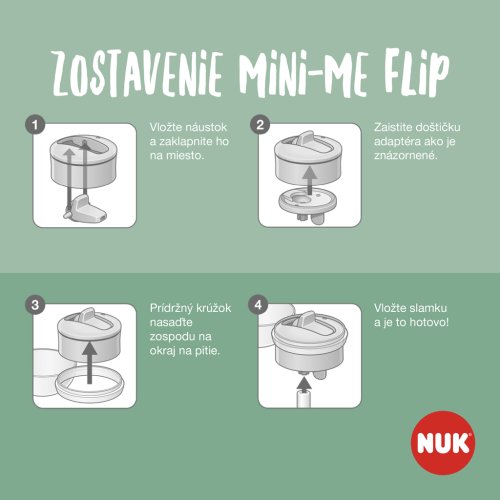 Důležité pokyny pro užívání Před prvním použitím rozložte výrobek podle návodu na jednotlivé díly, ty vyčistěte a na 5 minut umístěte do vroucí vody. Slouží to hygienickým účelům. Před každým dalším použitím pečlivě vyčistěte. V případě potřeby sterilizujte. Uchovávejte v suchu a hygienicky. Při vyvařování nebo napařování lahev vždy rozložte na jednotlivé díly a nechte otevřené, protože jinak může dojít k jejich deformacím. Při napařování doporučujeme použít parní sterilizátor NUK. K zabránění poškození materiálu vždy dodržujte návody k použití odpařovače. Při dezinfekci plastových lahví nesmí být překročena maximální teplota 100°C (pokyn na lahvi). Savičku na krmení nebo lahev nikdy nevystavujte přímému slunečnímu záření nebo teplu nebo ji nenechávejte déle než je uvedeno v dezinfekčním prostředku (sterilizační roztok), může to snížit pevnost savičky nebo poškodit materiál. Pro Mini-Me Flip z PP: Lahve vždy ohřívejte otevřené (nebezpečí výbuchu) a ochlaďte (deformace)! Při ohřívání v mikrovlnné troubě je důležitá opatrnost; může dojít k místnímu přehřátí. Ohřáté potraviny se musí vždy promíchat a před krmením se musí zkontrolovat teplota. Pro Mini-Me Flip z ušlechtilé oceli: Lahev z ušlechtilé oceli se nesmí používat v mikrovlnné troubě (nebezpečí výbuchu/poškození materiálu). Lahev nenaplňujte nápoji sycenými oxidem uhličitým nebo příliš horkými nápoji. Může vzniknout přetlak, který může vést k vytečení tekutiny. V prostorách s podtlakem (např. v letadlech) se mohou vyskytovat netěsnosti. Při plnění nápojem připraveným z instantního prášku dbejte na to, aby se prášek zcela rozpustil. Usazeniny nebo ovocná dužina mohou zhoršit funkci silikonového těsnicího kroužku. Při přepravě zaklapněte náústek a nasaďte kryt. Pro bezpečnost a zdraví Vašeho dítěte UPOZORNĚNÍ! Neustálé a dlouhodobé sání tekutin způsobuje zubní kaz. K poškození zubní substance může u malých dětí dojít také tehdy, pokud konzumují tekutiny bez cukru. Před krmením vždy zkontrolujte teplotu jídla. Při prvním náznaku poškození nebo opotřebení výrobek vyhoďte. Nepoužívané součásti výrobku uchovávejte mimo dosah dětí. Nikdy nespojujte se šňůrami, stuhami, tkaničkami nebo s volnými částmi oblečení, mohlo by dojít k uškrcení dítěte. Používejte tento výrobek vždy pod dohledem dospělých. Nikdy nepoužívejte dudlík na krmení jako běžný dudlík. Lahev je vhodná pro děti od 12 měsíců a nesmí být používána ke krmení malých miminek. Jednotlivé díly uchovávejte mimo dosah dětí: – hrozí nebezpečí spolknutí, – hrozí přivření prstů. U nástavce pro pití vždy zkontrolujte známky použití. Při viditelném poškození jej vyměňte. Jestliže lahev vykazuje na vnitřní straně poškození (např. škrábance), musí být z hygienických důvodů vyměněna. Uchovávejte hygienicky a v suchu. Lahvičky a nástavce pro pití NUK je možné kombinovat pouze s příslušnou produktovou sérií. Čištění