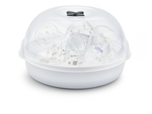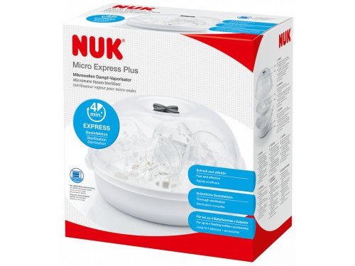 Sterilizátor NUK Micro Express Plus efektivně sterilizuje až 4 kojenecké lahve a doplňky během pouhých 4 minut při 1000 W.