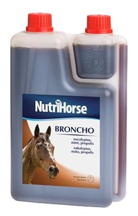 NutriHorse BRONCHO je tekutý přípravek, který obsahuje zdraví prospěšný eukalyptus a mátu. Tyto byliny byly využívány po staletí na léčbu kašle a při podráždění horních cest dýchacích. Zlepšuje kvalitu dýchání u koní. Přípravek je vhodné podávat na podporu léčby kašle a rýmy (ucpání horních cest dýchacích). Zlepšuje reakce imunitního systému díky obsahu propolisu. Složení: