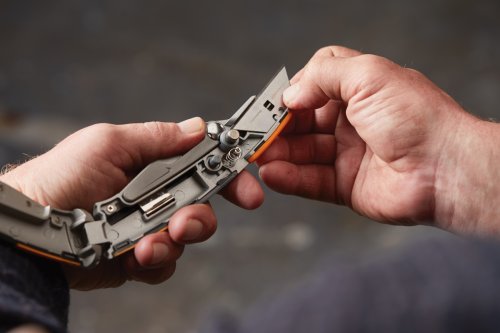 Univerzální nůž s pevnou čepelí lze ovládat rychle a bezpečně jednou rukou. Má ergonomickou rukojeť s technologií SoftGrip. Obsahuje unikátní kryt skládací čepele pro maximální bezpečnost. Rukojeť je kovová pro optimální vyvážení a odolnost, za končení je z tvrzeného kovu, poskytuje spolehlivou odolnost vůči nárazům a pádům. Má zásobník pro uložení 5 ks čepelí. Výška: 30 mm, délka: 259 mm, šířka: 109 mm, hmotnost: 232 g. Záruka: 5 let.