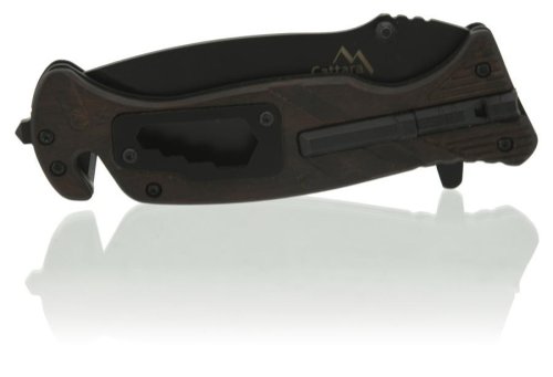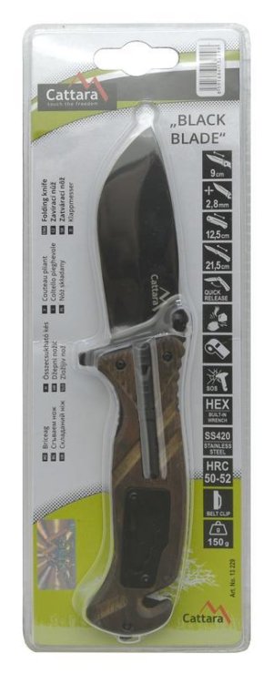 Skládací 21,7cm kapesní nůž Cattara Black Blade je nezbytnou součástí výbavy pro camping, rybaření a většinu outdoorových aktivit. Čepel nože je zhotovena z martenzitické oceli SS420, délky 9 cm o síle 2,8 mm. Tato ocel je vysoce kvalitní a dosahuje vynikající tvrdosti HRC 50-52 a je obzvláště vhodná do nepříznivého prostředí, kde exceluje svou odolností vůči korozi a vnějším vlivům.