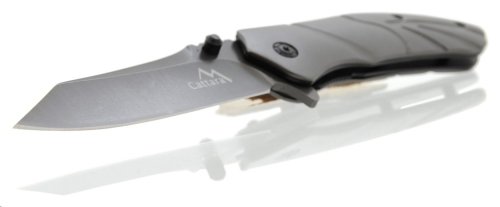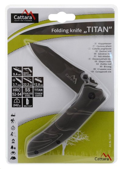 Skládací 22,2cm kapesní nůž Cattara Titan je nezbytnou součástí výbavy pro camping, rybaření a většinu outdoorových aktivit. Čepel nože je zhotovena z nožířské oceli 420J2, délky 9,4 cm o síle 3,7 mm. Tato slitina chromu, niklu, manganu, křemíku, fosforu, uhlíku, síry a železa dosahuje vynikající tvrdosti HRC52-54 a je obzvláště vhodná do nepříznivého prostředí, kde exceluje svou odolností vůči korozi a vnějším vlivům.