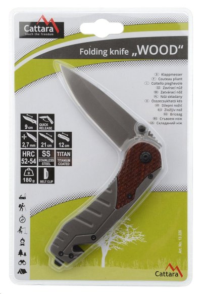 Skládací 21cm kapesní nůž Cattara Wood je nezbytnou součástí výbavy pro camping, rybaření a většinu outdoorových aktivit. Čepel nože je zhotovena z nožířské oceli 420J2, délky 9 cm o síle 2,7 mm. Tato slitina chromu, niklu, manganu, křemíku, fosforu, uhlíku, síry a železa dosahuje vynikající tvrdosti HRC52-54 a je obzvláště vhodná do nepříznivého prostředí, kde exceluje svou odolností vůči korozi a vnějším vlivům.