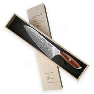 Rukojeť ze vzácného dřeva Rose-Wood zaručuje stabilitu a pohodlí při krájení. Její ergonomický tvar skvěle padne do ruky pravákům i levákům. Ozdobný nýtek podtrhuje precizní ruční zpracování. Spojení luxusního dřeva a damascénské čepele dělá z nože skutečný klenot kuchyně.