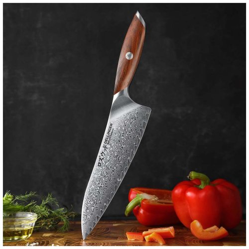 Dellinger Chef/Gyuto Rose Wood Damascus® je univerzální kuchyňský nůž, který díky 210 mm dlouhé čepeli zvládne širokou škálu úkolů od porcování masa až po krájení zeleniny či bylinek. Elegantní damascénský vzor Ame no Shizuku dodává noži nejen jedinečný vzhled, ale i praktické vlastnosti při krájení.