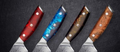 Pokud máte rádi originalitu, u tohoto nože je zaručená. Design rukojeti je opravdu jedinečný u každého kusu. Rukojeť se vyrábí z překrásné epoxidové pryskyřice. Jedná se o průhlednou pryskyřici probarvenou alkoholovými pigmenty. Pryskyřice je voděodolná a zcela bez zápachu. Časem se může stát, že se začne měnit barva. O pevné spojení damaškové oceli a rukojeti se postará také trojité nýtování. Tvar rukojeti je vhodný pro asijský úchop nože.