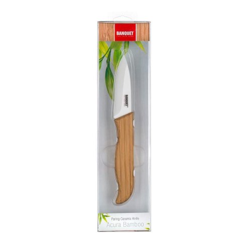 Nůž praktický keramický ACURA BAMBOO, bambusová rukojeť. Ostří keramického nože je vyrobeno z keramického materiálu zvaného oxid zirkoničitý. Tato sloučenina vyniká vysokou pevností a odolností. Ergonomická rukojeť z TPR s protiskluzovou úpravou. Nůž je velmi odolný proti skvrnám a snadno se čistí. Čepel do sebe nepropustí žádnou z kyselin obsažených v potravinách. Vitamíny se díky keramické čepeli z potravin neztrácejí. Maso, zelenina či ovoce se nelepí na nůž. Nůž má nízkou hmotnost a vyvážené těžiště, snadno se s ním manipuluje při práci. Keramické nože jsou tvrdší než kovové, proto nepotřebují každodenní přebrušování ocílkou jako ocelové. Daní za vysokou tvrdost je jejich křehkost, proto se nedoporučuje sekat s nimi např.kosti, lámat nůž při krájení a vyvarovat se pádu nože na zem.