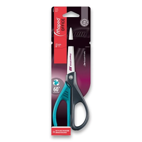 Nůžky Maped Essentials Metal Colours velikosti 21 cm mají rukojeť z 60% post-industriálního recyklovaného plastu.