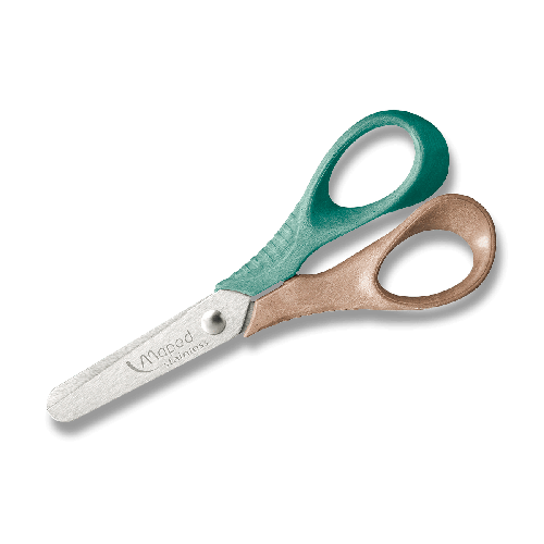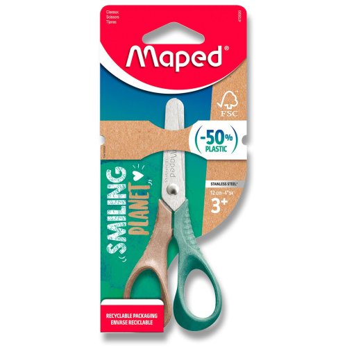 Školní nůžky Maped Smiling Planet Vivo velikosti 12 cm mají čepele vyrobené z broušené nerezové oceli.