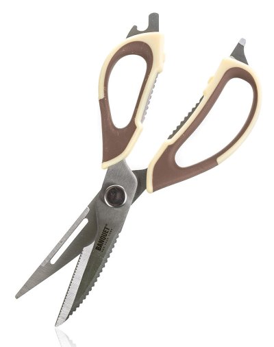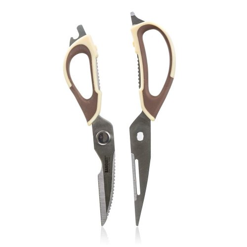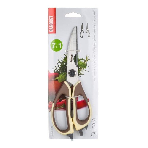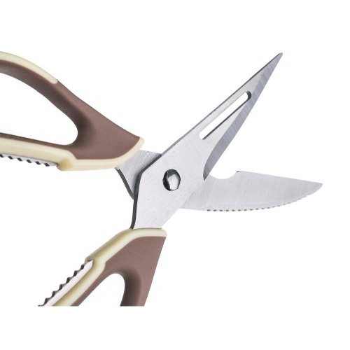Kuchyňské univerzální rozložitelné nůžky CULINARIA umožňují kromě stříhání také louskat ořechy, škrábat ryby, otevírat lahve, řezat kartony, škrábat ovoce a zeleninu nebo například stříhat drůbež. Rukojeti jsou v béžovo - hnědé barvě.