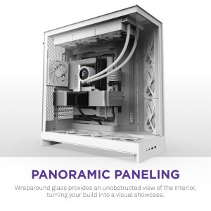 NZXT H9 Flow představuje stylovou počítačovou skříň ve formátu Middle Tower, která je navržena tak, aby poskytovala bohaté možnosti chlazení a vysoký výkon GPU. Rozsáhlé tepelné schopnosti umožňují instalovat celkem až 10 ventilátorů, přičemž 4 už jsou osazeny v základu. PC skříň NZXT H9 Flow se vyznačuje unikátním designem s nepřerušovaným skleněným panelem. Díky tomu vám poskytuje jasný vhled do interiéru.