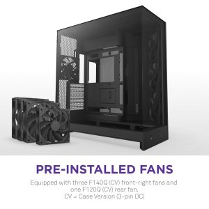 NZXT H9 Flow představuje stylovou počítačovou skříň ve formátu Middle Tower, která je navržena tak, aby poskytovala bohaté možnosti chlazení a vysoký výkon GPU. Rozsáhlé tepelné schopnosti umožňují instalovat celkem až 10 ventilátorů, přičemž 4 už jsou osazeny v základu. PC skříň NZXT H9 Flow se vyznačuje unikátním designem s nepřerušovaným skleněným panelem. Díky tomu vám poskytuje jasný vhled do interiéru.