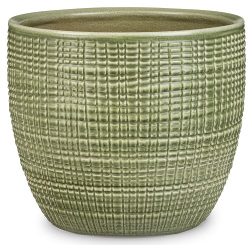 Ručně vyrobený květináč se silnými stěnami se hodí k mnoha subtilním pokojovým rostlinám s drobnými listy. Jemné prohlubně připomínající textilii propůjčují nádobě na květináč individuální charakter.