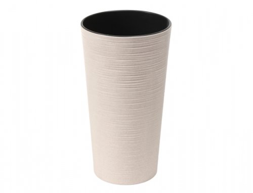 Vysoký plastový obal na květník s vnitřní vložkou má unikátní vzhled připomínající proutí. Je vhodný do interiéru i venkovních prostor, je odolný vůči UV záření. Obal je vyroben z recyklovaného plastu s obsahem až 40 % dřevěných štěpek. Barva: bílá. Barva je ovlivněna obsahem dřevěných štěpek. Průměr: 25 cm, výška: 47 cm.