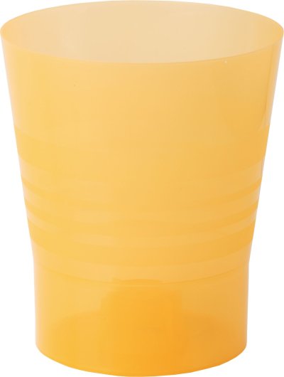 Transparentní oranžový plastový obal pro květníky s orchidejema do interiéru. Obal je jemně kónický a má na sobě lesklé a matné vodorovné pruhy. Rozměry: d. 15,5 x v. 18cm.