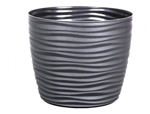 Matný plastový obal na květník s jemnými vlnkami po celém obvodu. Průměr: 13 cm, výška: 11 cm.