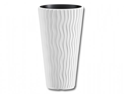 Vysoký plastový obal na květník s vertikálními drážkami připomínající vzor pouštního písku. Je vhodný zejména na terasy a do zimních zahrad. Barvy jsou odolné vůči slunečnímu záření, nízkým teplotám a mechanickému poškození. Průměr: 39 cm, výška: 71 cm.
