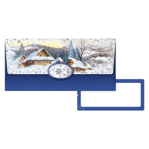 Dárková obálka na peníze s vánočním motivem zasněžené vesnice a uzavíratelnou klopou. Je ideální pro dárkové účely, kdy chcete peníze předat elegantním a vkusným způsobem. Uvnitř je kartička bez textu, na kterou můžete napsat věnování.