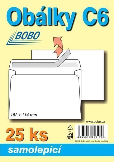 Obálky 162x114 mm, balení 25 ks.<br> <br> Balení klasických poštovních obálek ve formátu C6. Balíček obsahuje 25 kusů samolepicích obálek.