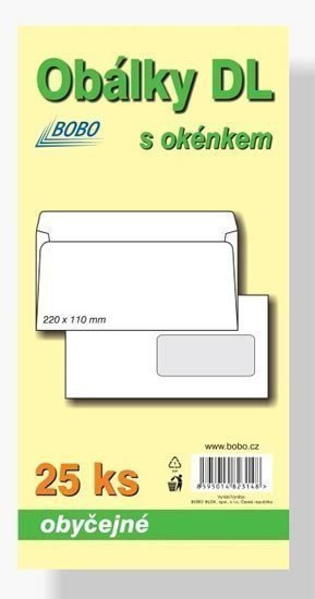 Obálky 220x110 mm, balení 25 ks.<br> <br> Balení klasických poštovních obálek ve formátu DL. Balíček obsahuje 25 kusů obyčejných obálek s okénkem.