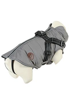 Praktická péřová bunda pro psy s integrovaným postrojem pro větší pohodlí a bezpečnost.