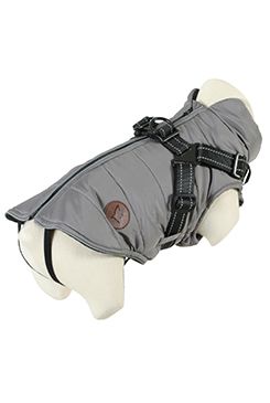 Praktická péřová bunda pro psy s integrovaným postrojem pro větší pohodlí a bezpečnost.