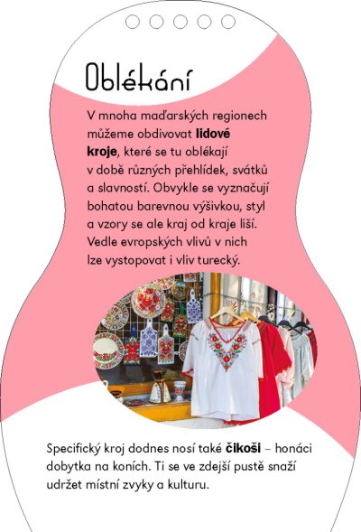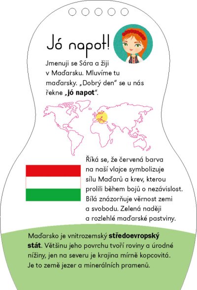 Další titul oblíbené série, která našla své obdivovatele v desítkách zemí světa, představuje malým čtenářům kouzlo Maďarska prostřednictvím panenky Sáry. Kreativní omalovánky, spousta samolepek… knížka obsahuje vše, co je třeba k vytvoření nesčetných modelů podle maďarské módy. A k tomu se děti dočtou i spoustu zajímavých informací navrch! Jak se jejich vrstevníci v Maďarsku zdraví, jak se tam učí, na jakých specialitách si pochutnávají? Víte, jak chutná hálászlé nebo kdo jsou čikoši? To a ještě mnohem víc se dozvíte, vydáte-li se za poznáním s našimi panenkami. A ke každé knížce dostanete krásný náramek pro štěstí!