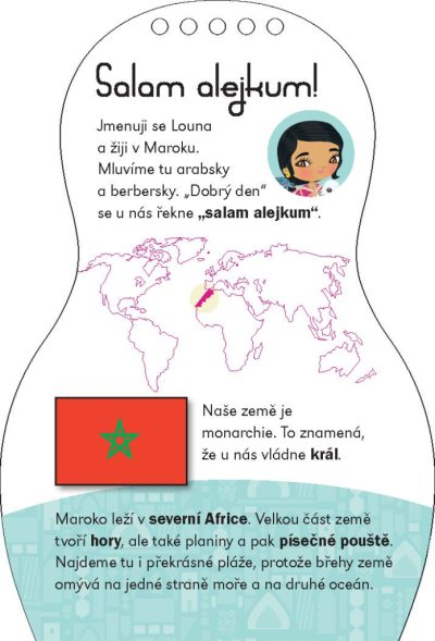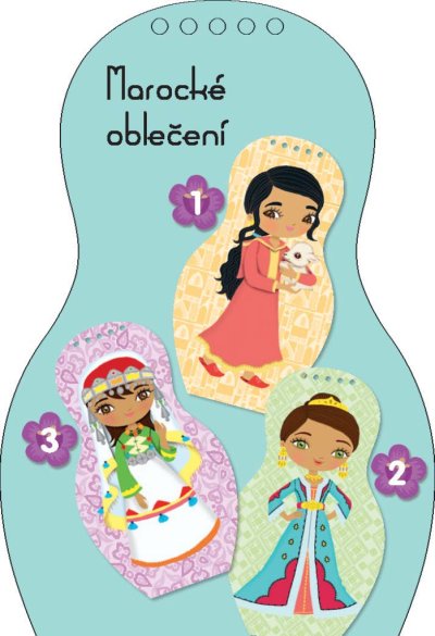 Další titul oblíbené série, která našla své obdivovatele již v téměř třiceti zemích světa, představuje malým čtenářům kouzlo Orientu prostřednictvím panenky Louny. Kreativní omalovánky, spousta samolepek… knížka obsahuje vše, co je třeba k vytvoření nesčetných modelů podle marocké módy. A k tomu se děti dočtou i spoustu zajímavých informací navrch! Jak se jejich vrstevníci v Maroku zdraví, jak se tam učí, na jakých specialitách si pochutnávají? Víte, co je to tažín nebo jak vypadá dželaba? To vše a ještě mnohem víc se dozvíte, vydáte-li se za poznáním s našimi panenkami. A ke každé knížce navíc dostanete krásný náramek pro štěstí!