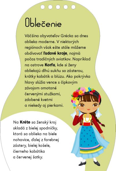 Další titul oblíbené série, která našla své obdivovatele v desítkách zemí světa, představuje malým čtenářům kouzlo Řecka prostřednictvím panenky Eleny. Kreativní omalovánky, spousta samolepek… knížka obsahuje vše, co je třeba k vytvoření nesčetných modelů podle řecké módy. A k tomu se děti dočtou i spoustu zajímavých informací navrch! Jak se jejich vrstevníci v Řecku zdraví, jak se tam učí, na jakých specialitách si pochutnávají? Víte, co jsou tzatziky nebo co je sirtaki? To a ještě mnohem víc se dozvíte, vydáte-li se za poznáním s našimi panenkami. A ke každé knížce dostanete krásný náramek pro štěstí!