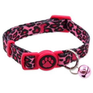 Nastavitelný nylonový obojek s leopardím potiskem a rolničkou.