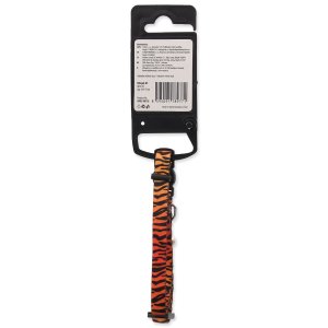 Nastavitelný nylonový obojek s tygřím potiskem a rolničkou.