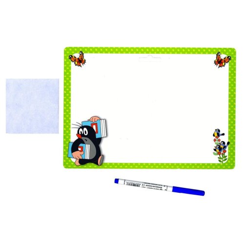 materiál pevný silný karton, lesklý povrch z rubové i lícové strany, součástí výrobku 2 stíratelné popisovače modré a černé barvy, slouží k opakovanému nácviku psaní i kreslení, tabulka vytvořena na základě doporučení poradny pedagogů