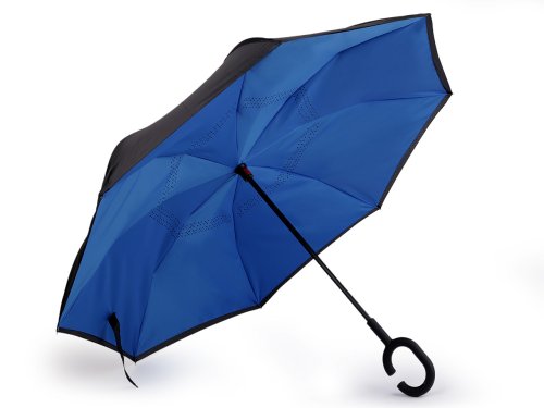 Obrácený deštník s okrasně perforovaným vnitřním potahem má revoluční řešení konstrukce. Díky opačnému otevírání a zavírání deštníku směrem vzhůru voda zůstane schovaná uvnitř v deštníku. Je to veliká výhoda např. když usedáte do automobilu, voda na vás již při zavírání nesteče, ale zůstane v deštníku. Jistě oceníte i jeho praktické sušení. Deštník sám stojí, stačí jej postavit na vhodné místo a voda sama steče ven, deštník už nemusíte rozevírat. Rukojeť ve tvaru C umožňuje deštník zaháknout přímo na paži, vaše ruce zůstanou volné např. k telefonování. Deštník má klasickou tyč zakončenou pevnou pogumovanou soft touch rukojetí ve tvaru C. Má dvojitý potah, spodní má odvětrávání. Skládá se z 8 výsečí. Díky dvojité konstrukci, která je schovaná mezi potahy, má deštník vysokou pevnost a stabilitu. [Deštníky založené na stejném principu, jen v jiných designech, najdete také na kartě 530028.]