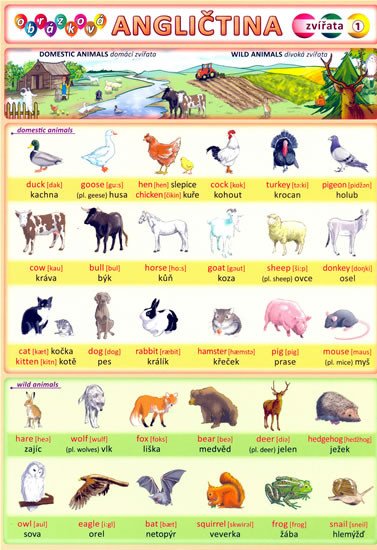 Ilustrovaný slovník zpracovaný dle jednotlivých témat. Názorné ilustrace pomáhají zapamatovat si nová slovíčka. 62 slovíček s výslovností - zvířata domácí, divoká, exotická, hmyz. Označení nepravidelných tvarů plurálu. Ilustrace od Petra Kopla.
