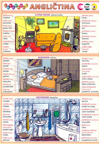 Ilustrovaný slovník zpracovaný dle jednotlivých témat. Názorné ilustrace pomáhají zapamatovat si nová slovíčka. 96 slovíček s výslovností – obývací pokoj, ložnice, koupelna, kuchyně, elektrické vybavení, na stole, 14 frází. Ilustrace od Petra Kopla.