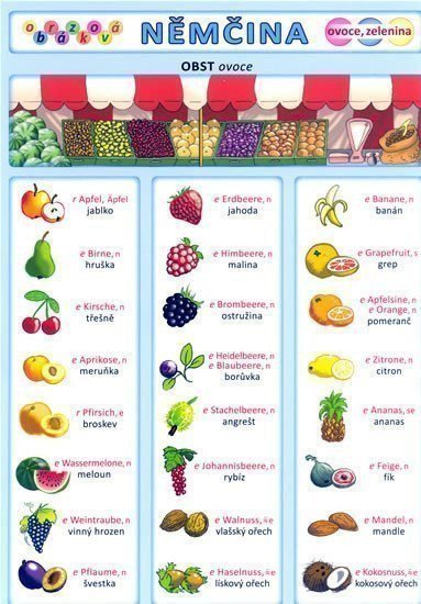 Ilustrovaný slovník zpracovaný dle jednotlivých témat. Názorné ilustrace pomáhají zapamatovat si nová slovíčka. 24 druhů ovoce, 24 druhů zeleniny. Tvary singuláru a plurálu. Ilustrace od Petra Kopla.