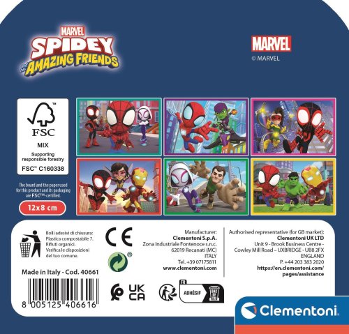 Sada 6 obrázkových kostek od Clementoni s motivem Spidey a jeho úžasní přátelé. Lze sestavit 6 různých obrázků dle předlohy nebo využít ke klasické hře s kostkami, ke stavbě komínů a věží. Ideální pro stimulaci pozorovacích schopností, stejně jako logické a manuální dovednosti. Kostky jsou vyrobeny ze 100% recyklovaných a recyklovatelných materiálů. Rozměr balení: 13x12x4,5 cm. Věk 2+