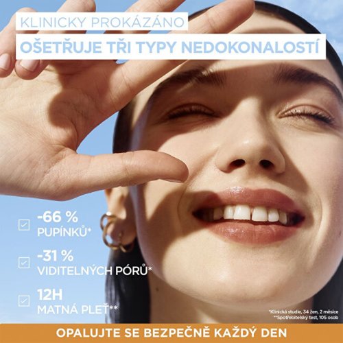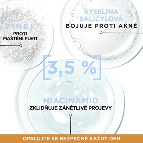 Denní fluid s velmi vysokou ochranou SPF 50+ proti UVB a UVA záření, vhodný pro citlivou pleť. Obsahuje 3,5 % niacinamidu, kyselinu salicylovou a zinek pro každodenní boj proti nedokonalostem a 12hodinový matující účinek. Jeho lehká textura se okamžitě vstřebává a zanechává neviditelný, nemastný a nelepivý finiš.