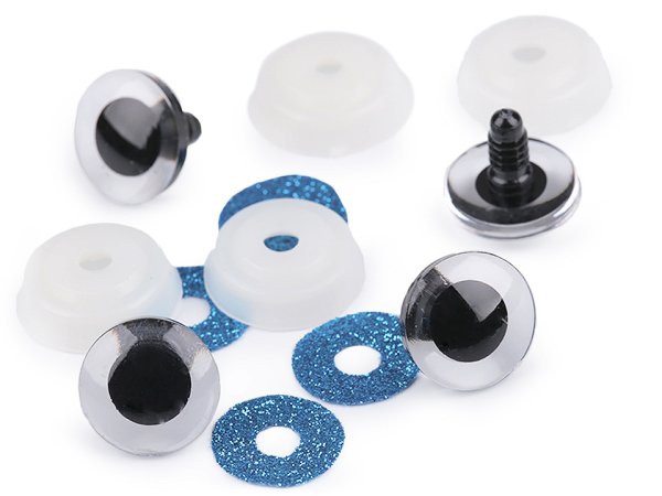 Polokulaté oči se třpytivou duhovkou umocní výraz vašich nejrůznějších postaviček či zvířátek. Mají závit, na který se nasadí duhovka, následně se provleče materiálem, a z druhé strany se pak nacvakne pojistka, která oči bezpečně připevní na místo. Pokud nebudete chtít, aby se oči třpytily, nemusíte duhovku použít, v tom případě zůstane duhovka transparentní. 1 sada = 1 oko + 1 třpytivá duhovka + 1 pojistka Délka vrutu je 1 cm. [Na zacvaknutí pojistky je nutné vynaložit větší sílu.]