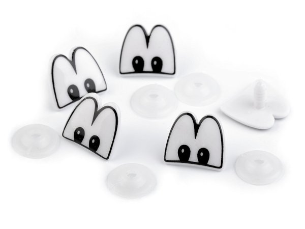 Plastové oči s uličnickým výrazem využijete pro výrobu různých zvířátek a postaviček např. plyšáků. Pro pevné přichycení mají oči na [vrutu] závity, které se pevně uchytí v materiálu používaném při výrobě plyšáků. Z druhé strany se nacvakne pojistka, která oči bezpečně zachytí na místo. Balení obsahuje oči i pojistky. Délka [vrutu] je 1,5 cm. Nevhodné pro děti do 3 let.