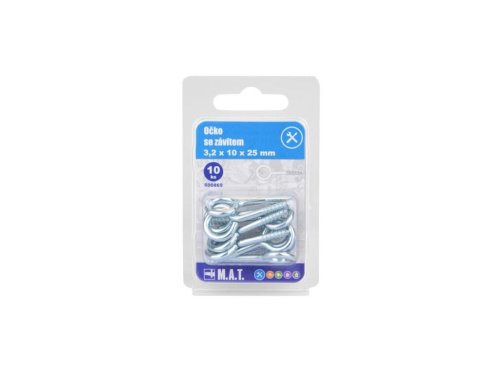 rozměry (D x pr. očka x pr.): 25 x 10 x 3,2 mm materiál: Zn 10 ks Zavřené očko se závitem 25 x 10 x 3,2 mm pro uchycení předmětů a břemen do různých materiálů.