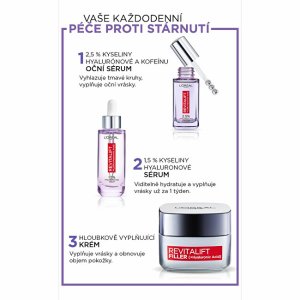 Oční sérum s obsahem kyseliny hyaluronové Revitalift Filler pomáhá rozjasnit oblast okolo očí. Poskytuje hloubkovou hydrataci a redukuje jemné linky a vrásky.