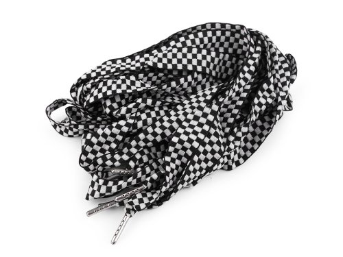 Plochá oděvní šňůra je měkká, krásně poddajná, se vzorem malých kostiček. Na obou stranách má kovovou koncovku s kulatým zakončením. Délka koncovek je 2 cm. Použití: Šňůra je vhodná do tunýlků bund, mikin, tepláků a jiných oděvů.