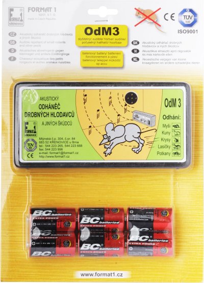 Odhání myši, krysy, potkany, kuny, lasičky, tchoře a jiné škůdce. Vydává pravidelně přerušovaný nepřelaďovaný tón. Délka tónu cca 1 s, délka pomlky cca 1 s. Vhodný pouze do prostorů, kde se lidé pohybují jen krátkodobě, nebo vůbec. Účinná plocha 100 m2. Napájení: 6 ks baterií řady "C" (R14, "střední monočlánky") - jsou součástí balení. Životnost baterií bývá cca. 6 měsíců.