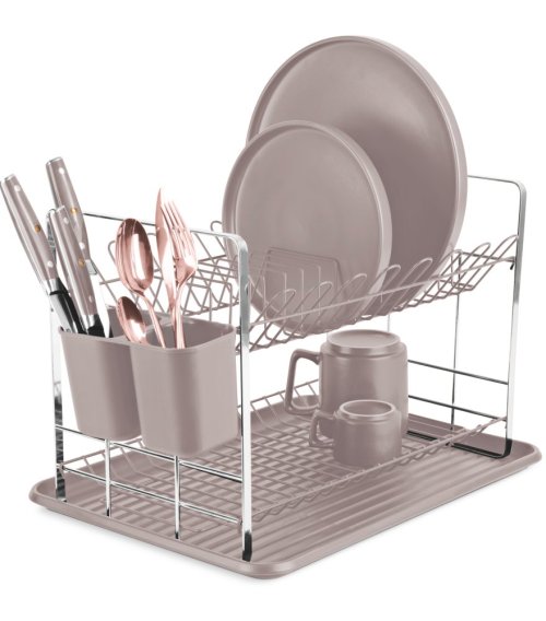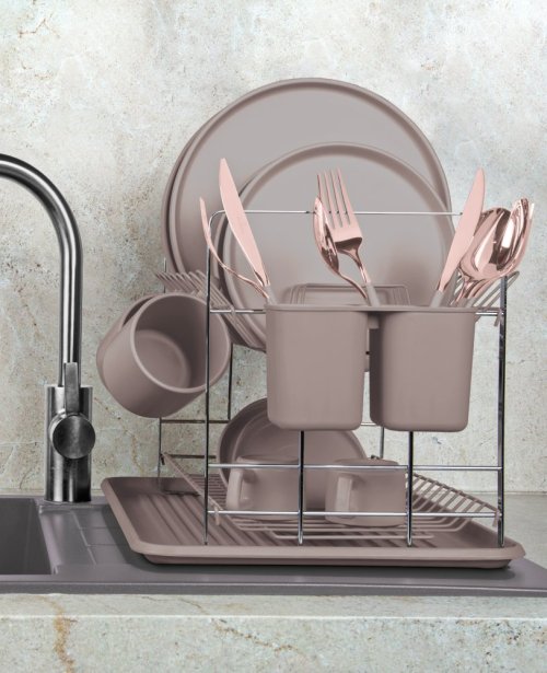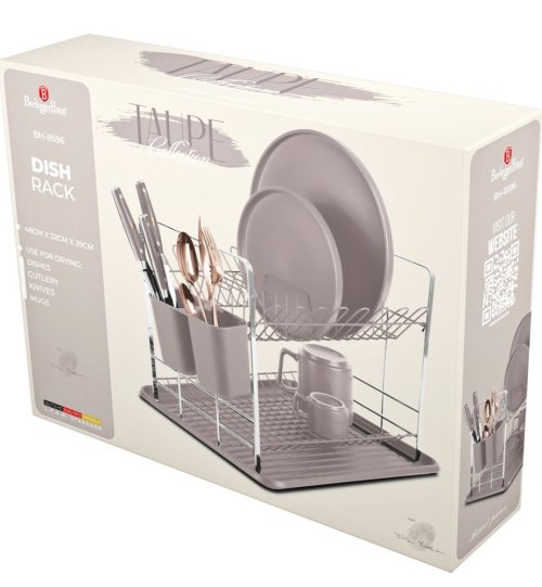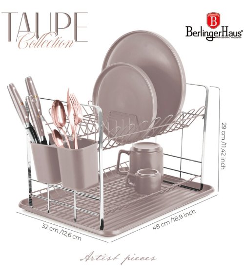 Dvoupatrový odkapávač na nádobí z kolekce Taupe od BerlingerHaus. Odnímatelný odkapávací tác. Dvě patra pro nádobí či skleničky a dva zásobníky na příbory a náčiní. Jednoduchá údržba a čištění. Designový kousek vyrobený v kombinaci plastu a kovu. Rozměry 48 x 32 x 29 cm