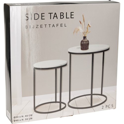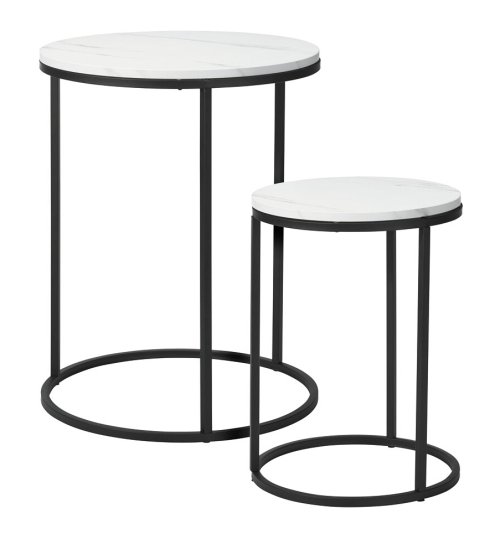 Stylová sada dvou odkládacích stolků v designu matného bílého mramoru. Kombinace pevné železné konstrukce a odolné MDF desky dodává interiéru elegantní a moderní vzhled. Ideální jako doplněk do obývacího pokoje, ložnice či pracovny.